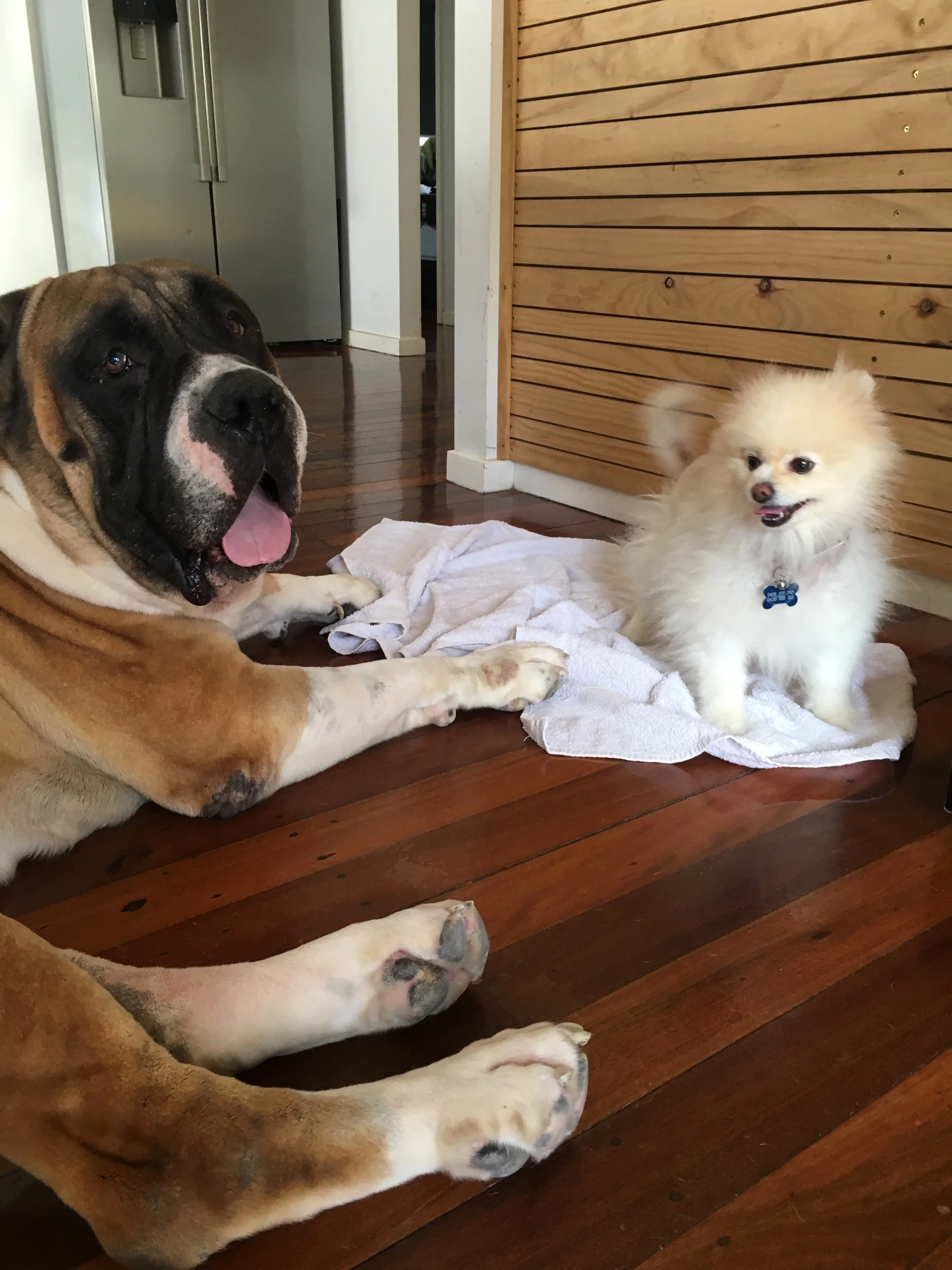 " Hi! My name is Jimmy and I am a Teacup Pomeranian. Going to Gregs house for holidays means that I get to hang out with Greg and my best Friend, Xerxes (Boerboel or South African Mastiff). He is a gentle giant! I also love the special treatment that I get from my "uncle Greg" when I am there. He is the BEST! Sometimes i miss my doggy friends so much that I ask my Mum and Dad to drop me there for the day to say hi."